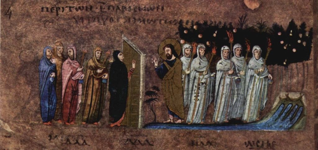 En revanche, elles sortent toutes à la rencontre de l’époux : c’est cela qui leur est commun, et qui fait qu’elles forment un groupe de dix. Elles sortent conformément à ce qu’elles sont : certaines avec des mesures qui tiennent à leur prévoyance, les autres avec l’élan de leur imprévoyance. Leur destinée n’est pourtant pas la même : pourquoi ? Et cette différence est liée ou illustrée par une différence dans les [lampadas]. La [lampas], c’est d’abord un flambeau, autrement dit ce n’est pas une petite lumière ténue de rien du tout, flammèche symbolique et facilement éteinte par le vent : c’est bien ce qu’il faut pour y voir clair et suffisamment nettement alors qu’il fait nuit. C’est exactement le mot qu’emploie Jean lorsqu’il raconte l’arrestation nocturne de Jésus au Jardin des Oliviers. Ici, ce ne sont pas de simples torches enduites de résine mais plutôt des appareils avec une réserve d’huile, puisqu’une partie du drame tourne autour de cette question de l’huile.