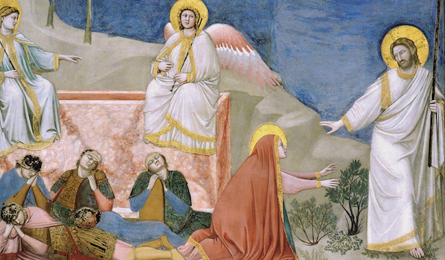 Ce n’est qu’après qu’elle ait été appelée de son nom que Marie est retournée, qu’elle reconnaît son « petit maître » ou « maître chéri », qu’elle entend son message et devient elle-même messagère. Et aux disciples elle dit cette fois : « J’ai vu le seigneur, et il m’a dit ces choses-là. » C’est un « voir », mais on ne parle pas du fait de « croire ». Le message qu’elle porte n’est pas « Je suis ressuscité » mais comme son sens ou sa dynamique : « Je monte vers mon père et votre père et mon dieu et votre dieu ». Pour le jeune disciple, on avait un « voir » et un « croire », sans explication. Pour Marie on a un « voir », accompli (un « j’ai vu », achevé) mais aucun « croire » : la chose est-elle absente, ou bien est-ce la rencontre et son retournement qui en tiennent lieu ?