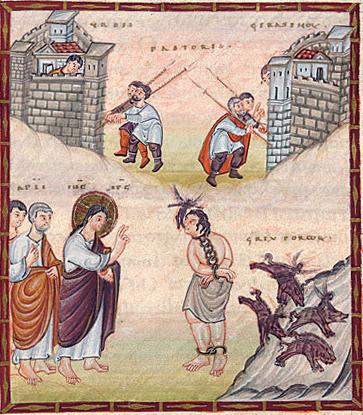Pour l’heure, cet homme est décrit avec exactement les mêmes mots que pour celui qui avait élevé la voix contre Jésus dans la synagogue de Capharnaüm, il est « dans un esprit non-épuré », c’est comme si la même histoire se rejouait et dans le même ordre, sauf que celui-ci sort des tombeaux ou des monuments funéraires : dans la tradition juive, les morts sont enterrés à l’extérieur de la ville ; dans la tradition grecque, la « nécropole » (une dénomination qui recouvre des réalités très variées) est hors les murs de la cité. Les tombes se concentrent au-delà des portes, près de carrefours routiers et le long des diverses routes qui partaient vers la chôra, c’est-à-dire le territoire de la cité. C’est en général un espace ouvert à tous les passants, dans la nature. Cela nous indique que cet homme habite tout près de la ville, mais pas dans son enceinte.
