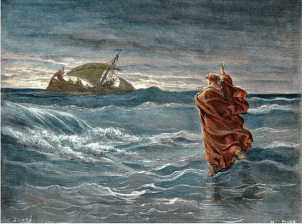 « Eux cependant, en le voyant marcher sur la mer pensèrent que c’était une vision, et ils poussèrent des cris : tous en effet l’avaient vu et ils étaient terrifiés. » Changement de point de vue : les marins parmi les Douze ont déjà sûrement récupéré en mer des malheureux, ils ont déjà vu de ces têtes qui surnagent encore, mais pour combien de temps ? Et ce sont eux qui, avec difficulté mais générosité, manœuvrent pour aller les sauver. Mais quelqu’un qui domine à ce point les difficultés qu’ils affrontent, cela ils ne l’ont jamais vu : d’où la « vision » ! Ce doit être dans leur tête (c’est le propre d’une vision), et non être réel. Mais si c’est une vision, certains peuvent l’avoir, mais d’autres non, et ceux-ci expliqueront à ceux-là qu’en effet, ce n’est pas réel. Or si tous la voient, cela devient terrifiant : comment faire la part du réel et de l’imaginaire ?! Et c’est là que naît la terreur, quand on n’arrive plus à décider de ce qui est réel et de ce qui ne l’est pas : c’est le ressort même du fantastique ! Et c’est ce qui peut se passer pour le croyant s’il ne confesse en même temps les trois temps que j’ai déjà énoncés : son désir profond, l’accomplissement de celui-ci, et son impuissance à l’accomplir par lui-même.