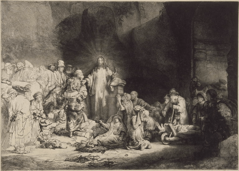 Les places publiques, ou les marchés (le mot est le même), sont évidemment plutôt en ville. On voit très bien la scène que ce grand coloriste qu’est Marc nous laisse voir : Jésus et les siens entrent en ville, et déjà la place publique est encombrée de brancards, de personnes atteintes de toutes sortes de maux, de gens « sans force physique » ou « sans vigueur », et qui supplient. On entend les cris monter immédiatement, pleins d’espoirs mais aussi lancinants et, disons-le, terriblement « dérangeants » comme le sont toujours les cris qui viennent de la souffrance pour les gens bien portants. Jésus n’a pas, on l’a dit en commençant, changé de projet, il vient avant tout porter la parole, mais voilà que toujours il rencontre d’abord ceux qui attendent de lui autre chose, la guérison, la vigueur, l’élan.